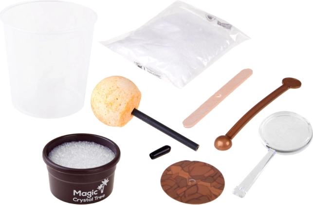 Komplektist leiad kõik vajaliku: 200 ml mõõtesilinder, kott kristallipulbri/liivaga, värviline kristalliseeme pulgal, segamispulk, luup üksikasjalikuks vaatlemiseks, puitalusplaat, stopper ja väike lillepott (alus). Protsess on lihtne ja turvaline – järgige juhendit ja töötage kuuma veega täiskasvanu järelvalve all.