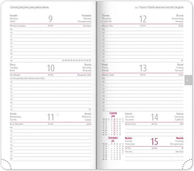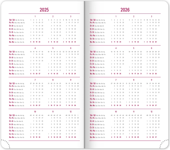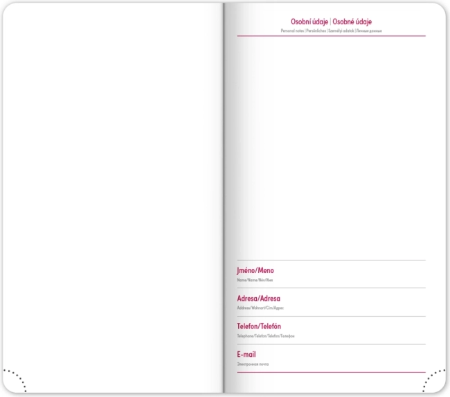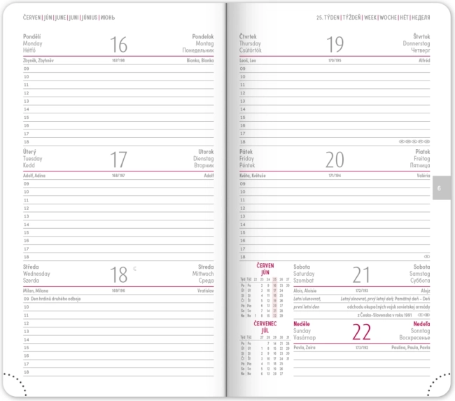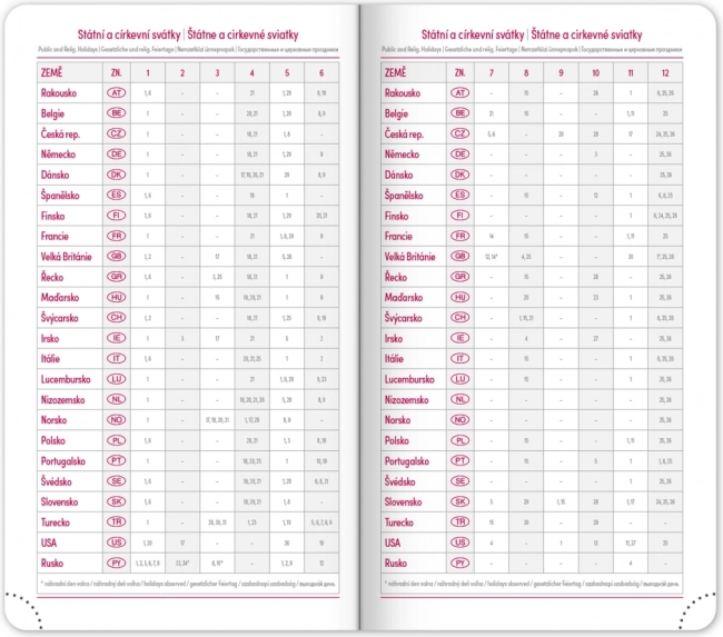 Märkmik pakub selget nädalapaigutust Tšehhi–Slovaki kalendariumiga ning lisaks inglise, saksa, ungari ja vene keelega. Olemas on kuu- ja aastaülevaated, pühade ülevaade, laiendatud nimekiri tšehhi nimedest ning kaardid. Ümarad nurgad, tekstiilist järjehoidja ja perforeeritud nurgad teevad igapäevase kasutamise lihtsaks, võimalus kanda aastaarvu ja logo fooliumtrükiga rõõmustab nii ettevõtteid kui ka nõudlikke kasutajaid.