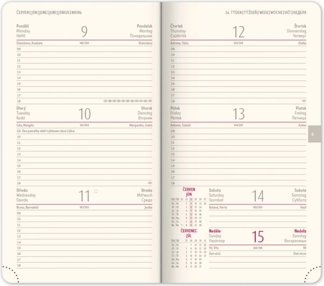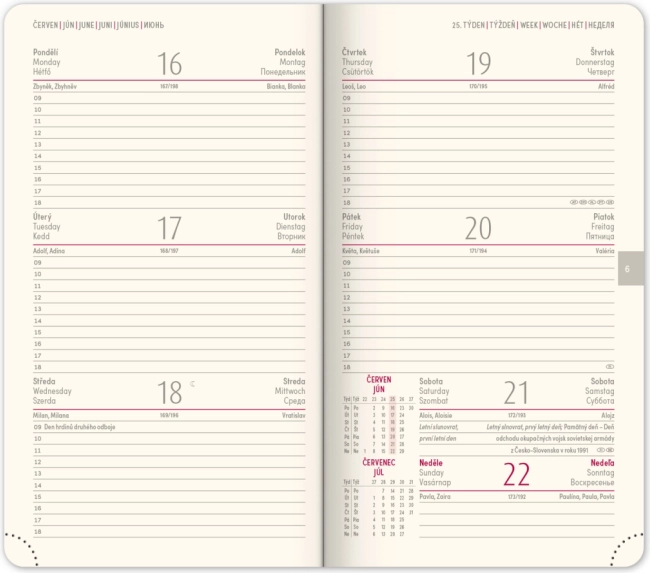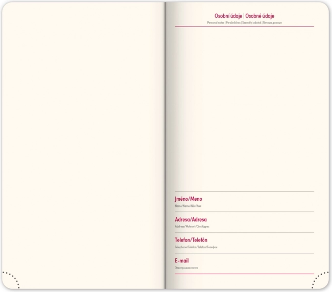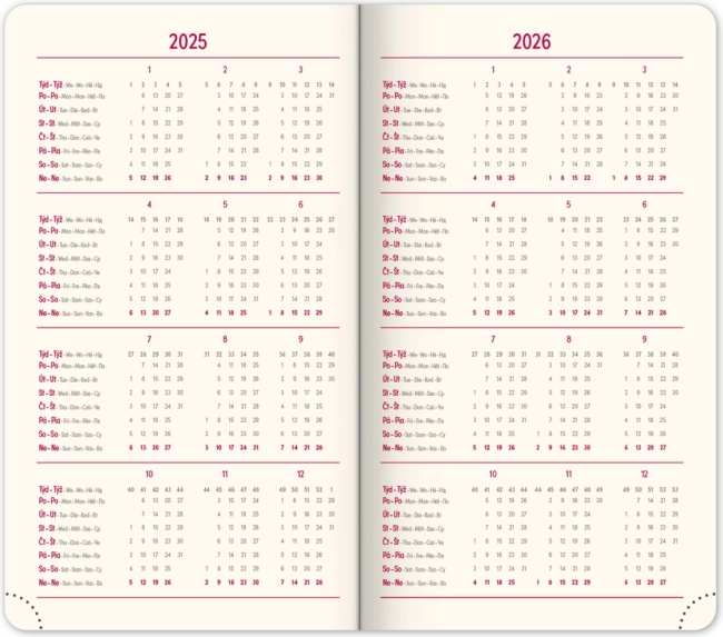 Elegantne taskuagenda Diamante 2025 punases värvitoonis pakub praktilist nädalavaadet koos tšehhi‑slovaki kalendariumiga ja lisakeeltega. Ideaalne igapäevaseks planeerimiseks teel olles – kompaktne formaat, kvaliteetne teostus ja kasutuslikud ülevaated. Kuu- ja aastaplaneerijad, Tšehhi ja Slovakkia kaardid, tekstiilist järjehoidja ning perforeeritud nurgad lihtsustavad orienteerumist ja korraldust.