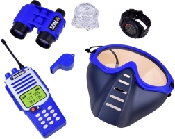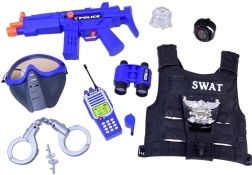 See rikkaliku sisuga politseikomplekt sinimustas stiilis muudab iga mängu põnevaks seikluseks. Lapsed panevad selga plastikust SWAT-vesti ning saavad raadiosaatja, binokli ja märgi abil korra kaitsjateks. Komplekt on loodud turvaliseks ja loovaks mänguks ning sobib suurepäraselt karnevaliks, teatriks ja igapäevaseks lõbuks.