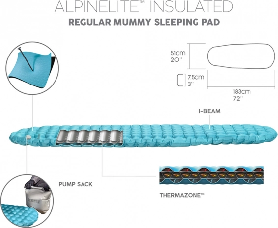 AlpineLite Insulated Regular Mummy magamisalune on ideaalne valik neile, kes soovivad nautida mugavust rannas lõõgastudes, laagris või ööbides telgis. Täispuhumine on lihtne ja kiire tänu uuenduslikule AirCinch süsteemile – piisab, kui surud peopesadega kotti, ning alune täitub kiiresti õhuga. Komplekt on terviklik, nii et ei pea muretsema, et pump ununeb.