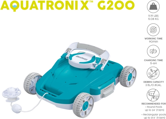 Hoia oma bassein pingutuseta puhtana robot-tolmuimejaga BESTWAY Aquatronix G200. Juhtmevaba töö, kuni 90 minutit ühe laadimisega ja autonoomne navigeerimine suunava vooluga tagavad usaldusväärse põhjapuhastuse. Libisemiskindlad rattad, lihtne juhtimine ühe lülitiga ja suur 3,5 l prahimahuti teevad sellest puhastist ideaalse lahenduse lamepõhjalistele maapealsetele basseinidele kuni 50 m².