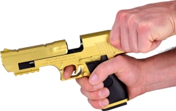 Mänguasi on kujundatud nägema välja nagu päris relv detailsete graveeringute ja kuldse metallikviimistlusega.