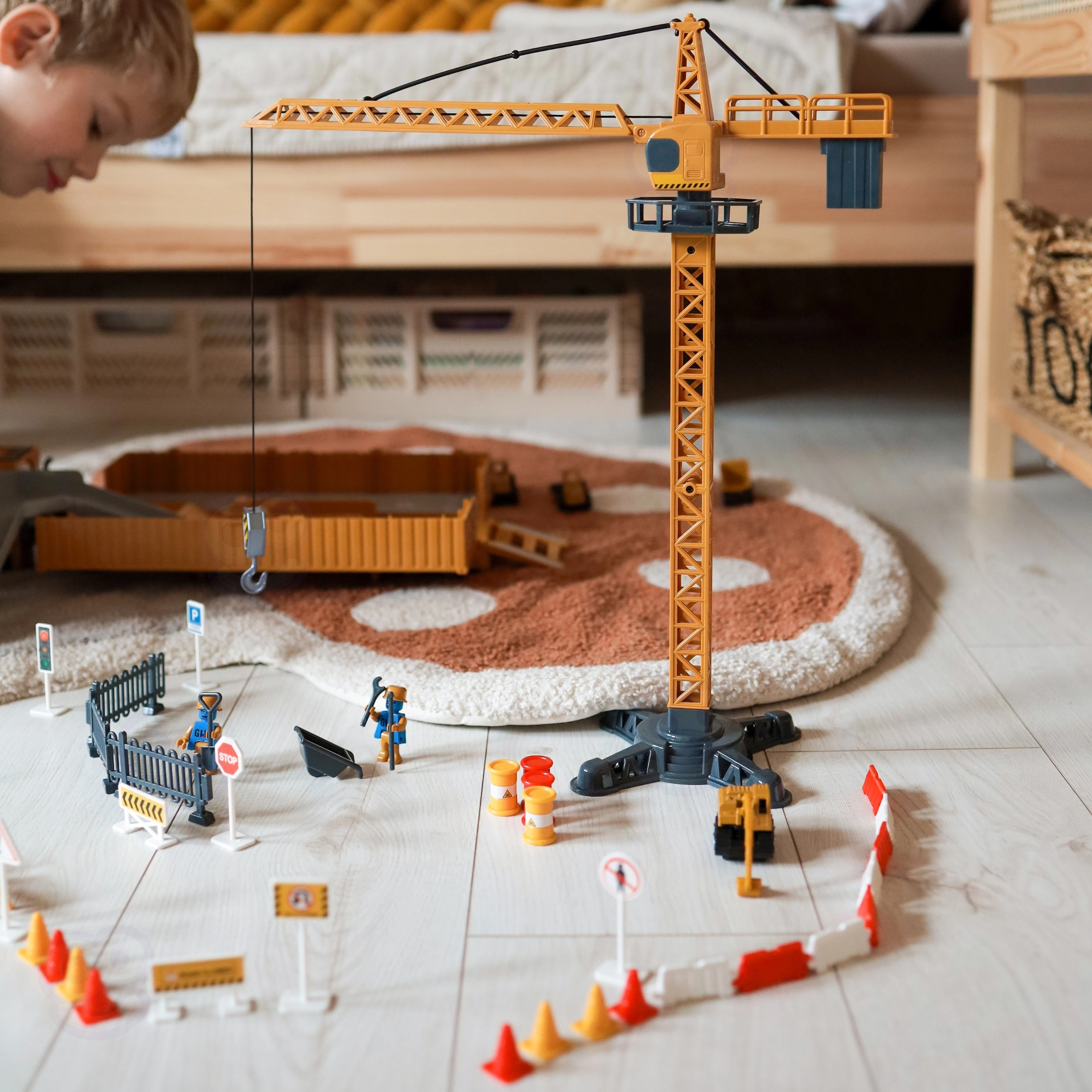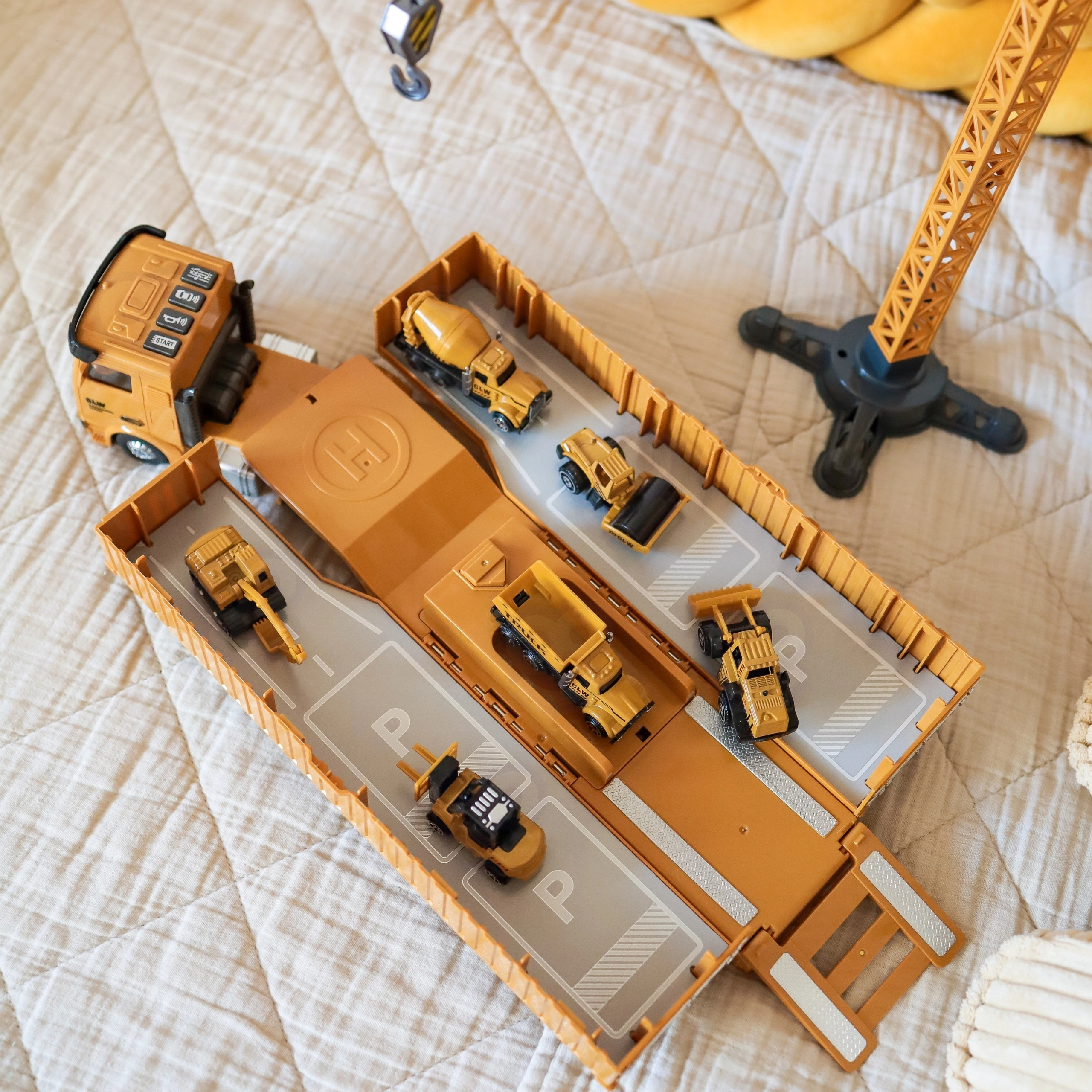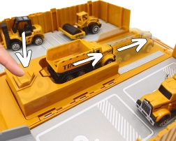 Komplekti kuulub tornkraana pöörlemise, trossi ja konksuga, mis suudab tarvikuid tõsta, ning samuti 6 liikuvat ehitusmasinat (nt ekskavaator, betoonimikser, kallur). Tööliste figuuridel on haarduvad käed tööriistade jaoks. Veokul on 4 interaktiivset nuppu signaali, tagurdamisheli ja meloodiatega, mida täiustavad vilkuvad punased tuled.