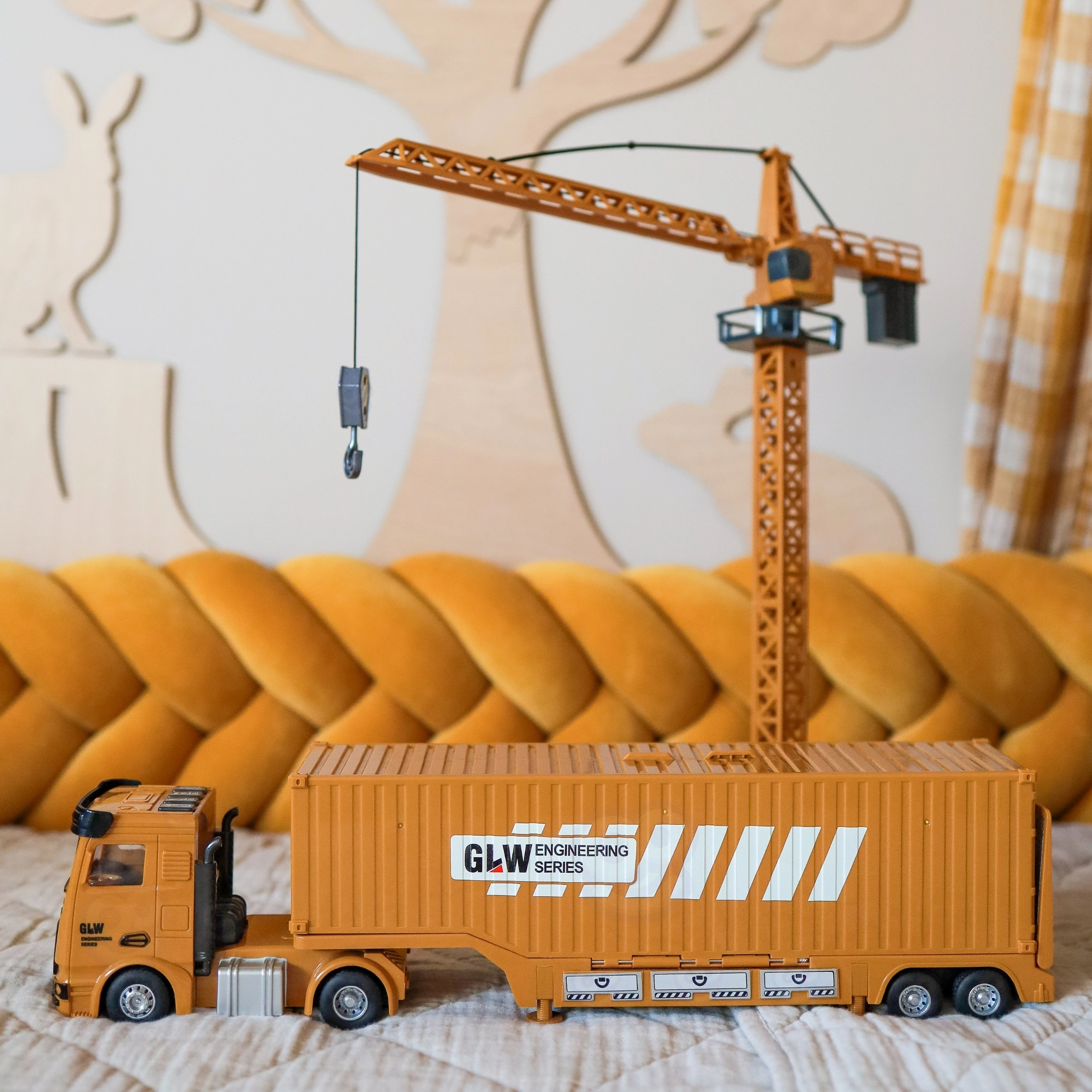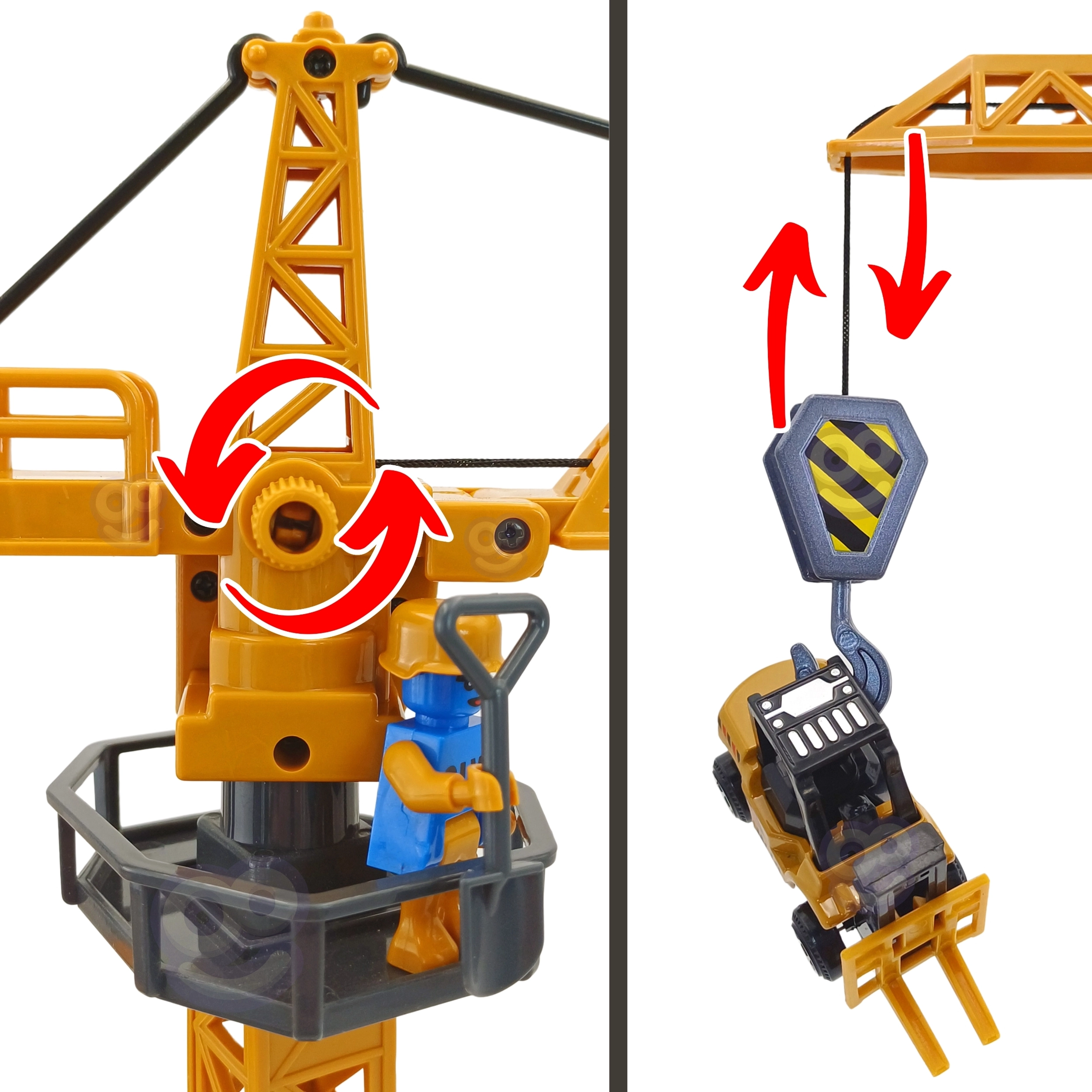 Kõrge kraana tõstab tarvikuid, pöörleb ja loob realistliku ehitusplatsi atmosfääri. Ideaalne konteinerite ja tünnide laadimiseks.