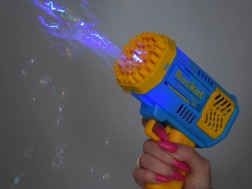Mullipüstol on unikaalne mullimasin, sest sellel ei ole sisseehitatud vedelikumahutit. Kuidas siis luua neid kauneid vikerkaarevärvilisi kuulikesi, mis õhku hõljuvad? See on lihtne! Vala komplekti kuuluva vedeliku väike kogus roosasse madalasse kaussi ja kasta sinna püstoli esiosa. Seejärel sihi ja vajuta päästikut. Sinu ees avaneb lummav vaatepilt! 40 avast lendavad välja ümarad, sädelevad mullid, mis toovad rõõmuhõiskeid paljudelt lastelt. Ka täiskasvanud on suurest muljest haaratud.