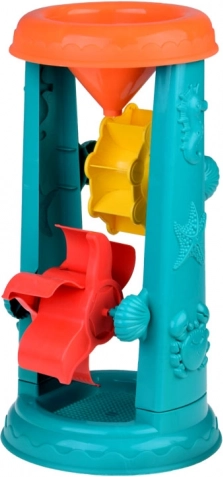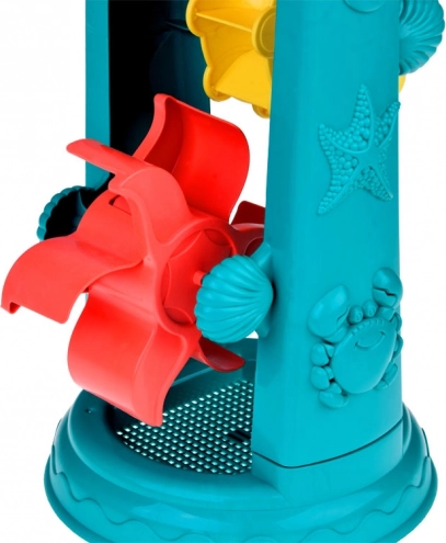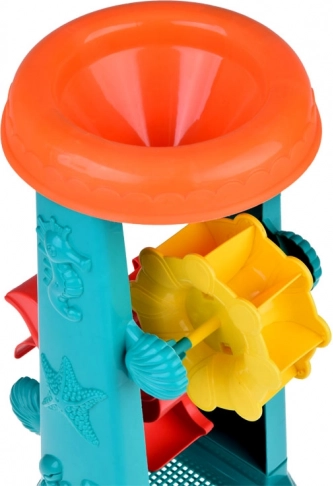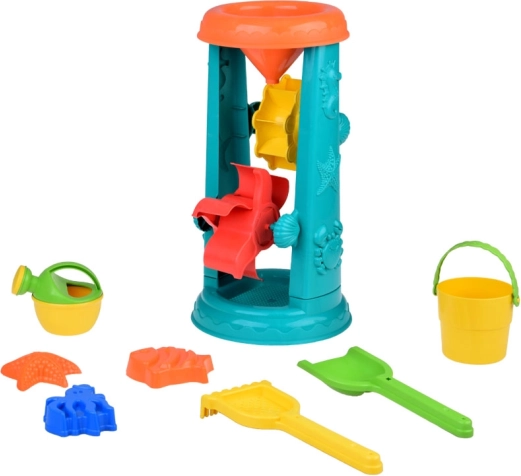 Laste liivakomplekt on hoolikalt kujundatud mereloomade motiividega, nagu kalakesed ja kaheksajalad. Suurimaks tõmbenumbriks on 37-sentimeetrine veeratas, kuhu lapsed saavad valada liiva või vett ja jälgida, kuidas topeltrattad pöörlevad. See toetab loogilise mõtlemise ja põhjus-tagajärg seoste mõistmise arengut.