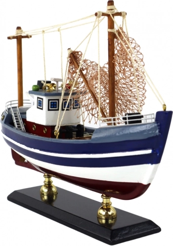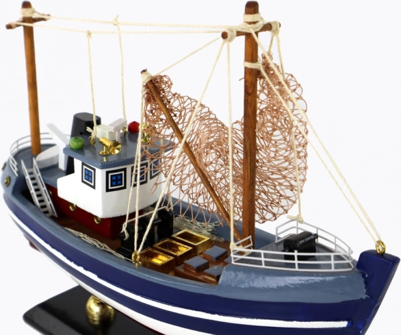 Mudelit iseloomustavad kõrged mastid, laevale pingutatud kalavõrk, kabiin on varustatud signaalsarvede ja hoiatustuledega. Vööris on dekoratiivne rool, mis viitab rikkalikule meresõidutraditsioonile. Suurepärane valik kui stiilne sisekujunduselement elutuppa, kontorisse või kollektsiooniriiulile.