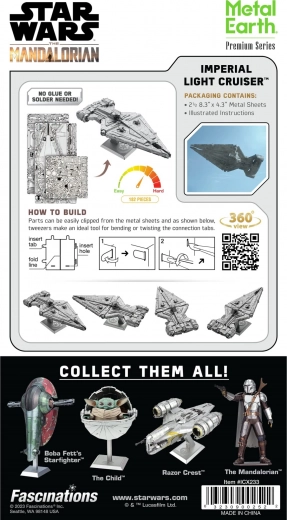 METAL EARTHi preemiumkomplekt toob sinuni truult vähendatud miniatuuri ikoonilisest laevast STAR WARSi maailmast. Vastupidistest teraslehtedest peene lasergraveeringuga koostad kavalalt läbimõeldud mudeli paneelide, düüside ja aluse embleemiga. Valmis mudeli mõõdud on umbes 17,2 × 7,1 × 6,4 cm ning see saab sinu vitriini pilgupüüdjaks.