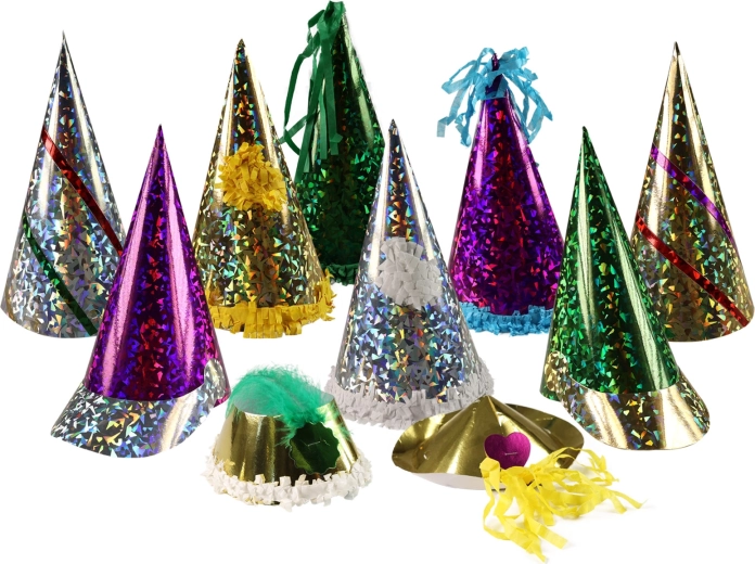 Lisa oma üritusele särtsu atraktiivsete metallikläikega peomütside seguga. Elastne kummipael tagab mugava püsimise peas ning sobivuse nii lastele kui ka täiskasvanutele. Pakis on erinevad versioonid – klassikalised koonuskübarad, nokaga mudelid ja tutikestega variandid, mis rõhutavad pidulikku atmosfääri.