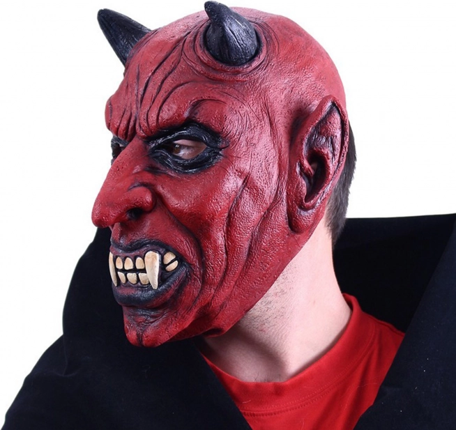 Väga detailne lateksmask realistlike kuradlike elementidega, sh mustad sarved ja teravad hambad, mis lisavad hirmutavat autentsust.