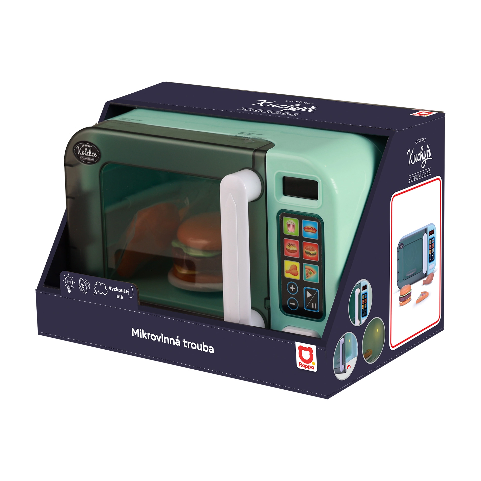 Mänguasi on valmistatud kvaliteetsest PVC-st ning komplektis on kolm toidulisandit (hamburger, kana, pitsa), mis toetavad fantaasia arengut, peenmotoorikat ja rollimängu. Töötamiseks on vaja 3× AA patareid (ei sisaldu komplektis). Kompaktne suurus umbes 26,5 × 17 × 17 cm sobib igasse mängukööki.