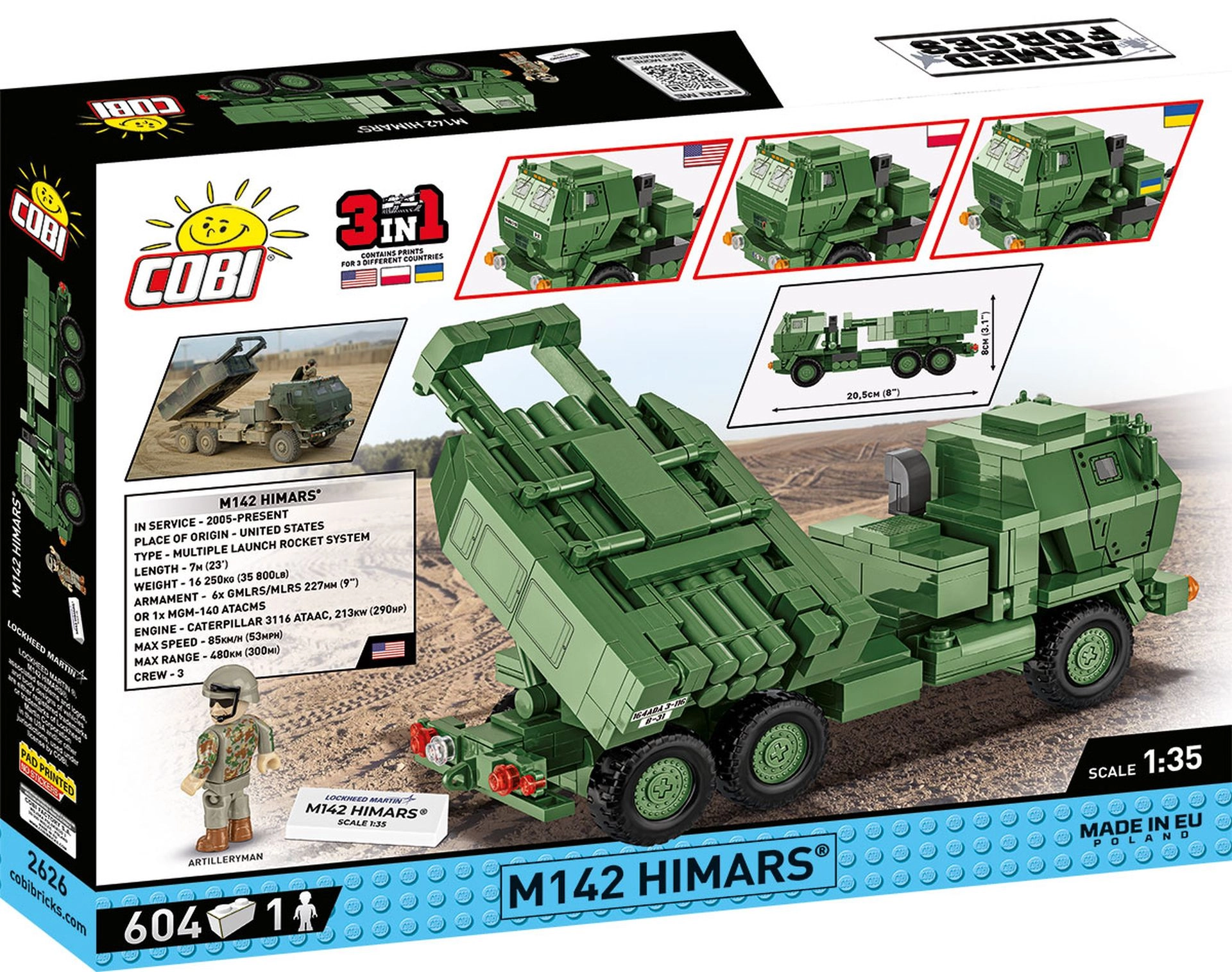 HIMARS mudel pakub realistlikku ehituskogemust mõõtkavas 1:35, kus saate tänu rikkalikule detailide valikule mudeli kokku panna oma soovi ja tähistuse järgi. Teie mudeli pikkus võib olla 20,5 cm ning see täiendab teie nüüdisaegsete sõjaväesõidukite ja -lennukite kollektsiooni.