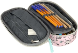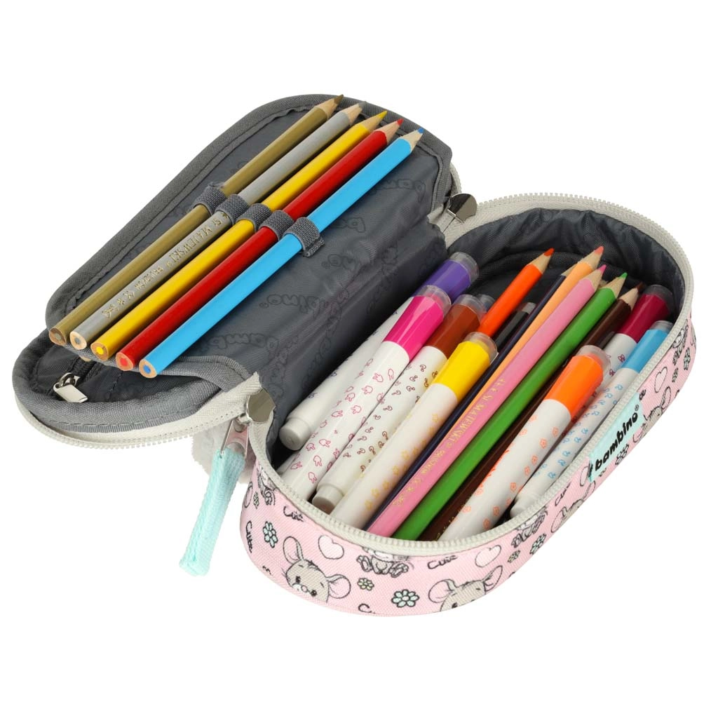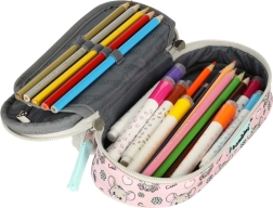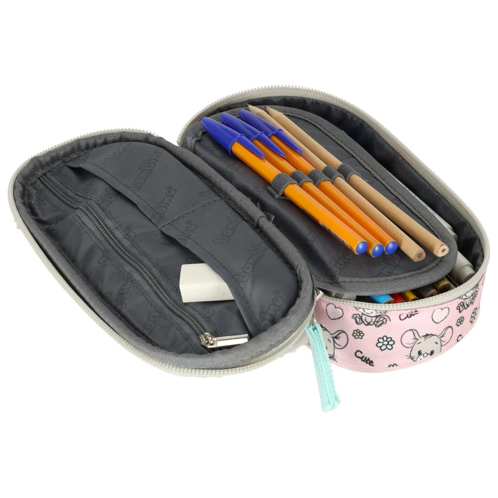 Sisemise jaotuse moodustab liikuv klapp kummiaasadega kirjutusvahenditele, tõmblukuga tasku pisiasjadele ja veel kaks lahtrit täiusliku korra tagamiseks. Topelttõmblukk ergonoomiliste tõmbikutega teeb avamise lihtsaks ka laste kätele. Stiili viimistlevad karvane loomamotiiv ja trükitud vooder.