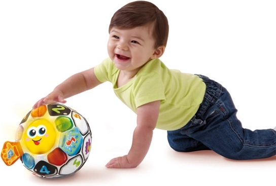 Tänu oma omadustele oskab pall lapse ees veereda, köites tähelepanu ja julgustades jälgima, roomama ja mängima. See värviline jalgpall eri tekstuuride ja heliefektidega mitte ainult ei arenda meeli, vaid pakub ka taktiilset stimulatsiooni tänu pehmele plüüssikale. Valgus- ja heliefektid koos helendava näo ja oranžide nuppudega aitavad lastel värve tundma õppida.