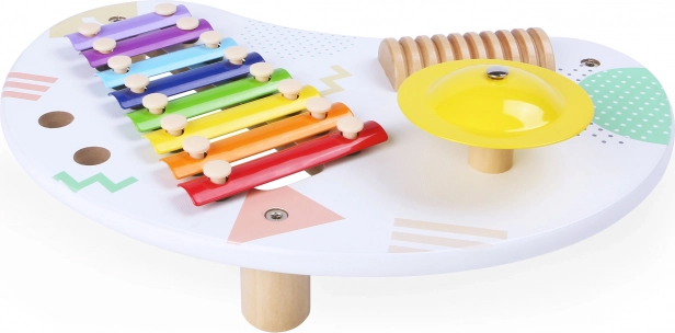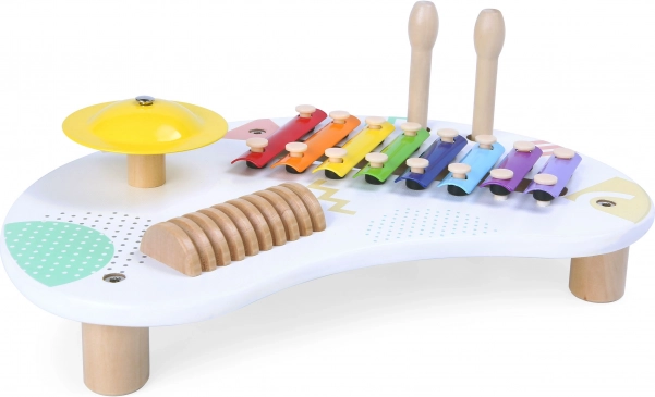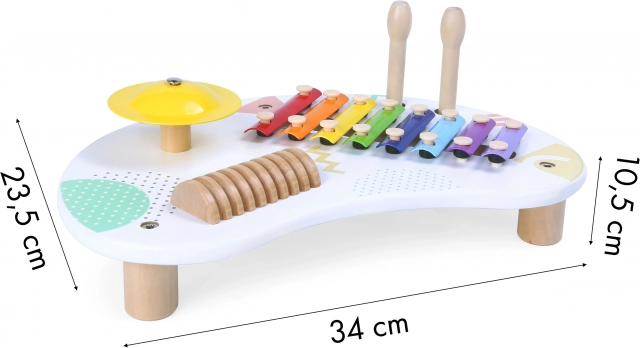 ECOTOYSi laste muusikaline laud on ideaalne valik väikestele muusikahuvilistele. See pakub mitmekesist 8-helilist ksülofoni, selgelt kõlavat taldrikut ja puidust kriiperit rütmisaateks. Tänu kahele puidust pulgale saavad lapsed lihtsalt proovida erinevaid helivärve ja harjutada käe-silma koordinatsiooni.