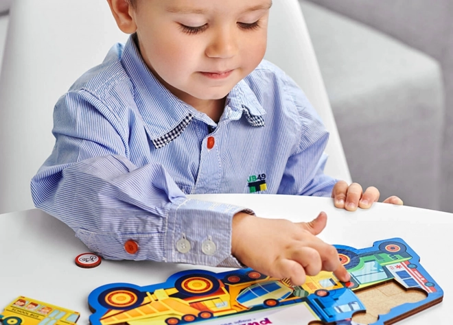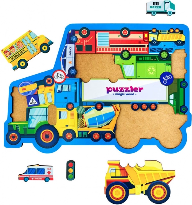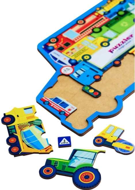 Transporditeemaline puidust pusle toob õppimise lasteni mängulisel moel. Iga 18 tükist kujutab eraldi sõidukit või liiklusmärki, mis aitab lastel harjutada kujundite äratundmist, sõnavara ja kannatlikkust. Tugev puidust teostus tagab pika eluea ja väikestele kätele turvalise käsitsemise.