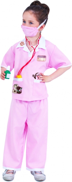 Laste veterinaari kostüüm õrnas roosas toonis stiilse loomamustriga toetab kujutlusvõimet ja armastust loomade vastu. Täiskomplekt on sobiv kasvule 117–128 cm ning sobib karnevaliks, maskeerimiseks ja koduseks mänguks.