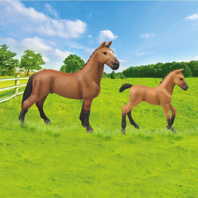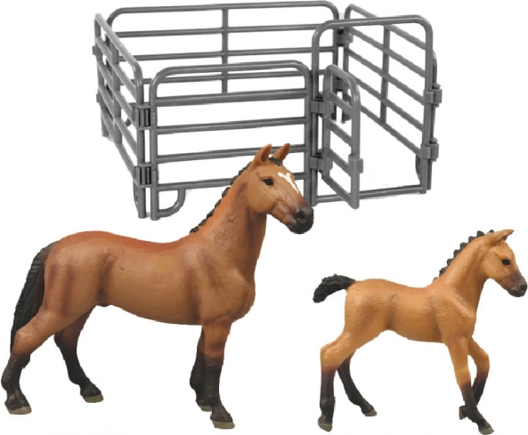 Ideaalne komplekt hobusesõpradele sisaldab hobuse ja varssa figuuri muljetavaldavas pruunis värvitoonis valge laikuga ning kaasas on aed.