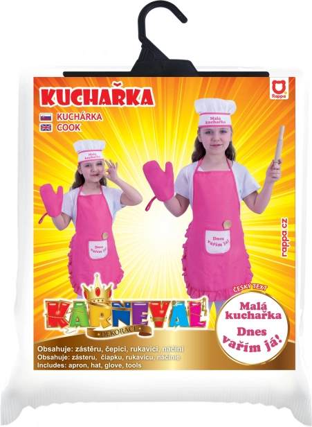 Ideaalne kostüüm igale väikesele kokale! See roosa komplekt sisaldab põlle, kokamütsi, pajakinda ja puidust tarvikuid – kõike, mida on vaja lõbusaks mänguks.