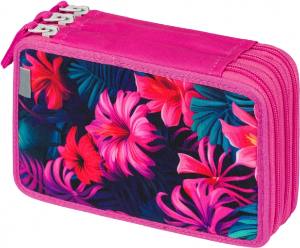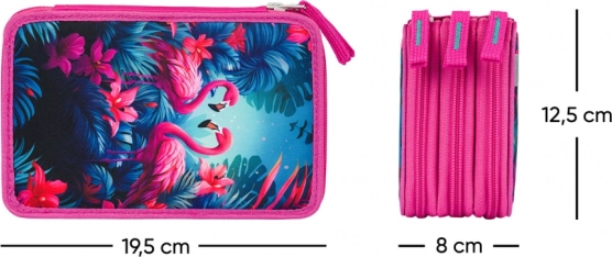 See kolmekordne koolipinal troopilise flamingomotiivi ja värviliste lehtedega pakub lisaks stiilile eelkõige funktsionaalsust kõigi sinu kirjatarvete organiseerimiseks. Iga sektsioon kasutab usaldusväärseid YKK kaubamärgi lukke ning tugevtatud selg hõlbustab sulgemisel käsitsemist.