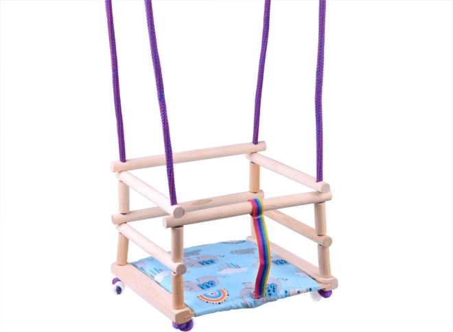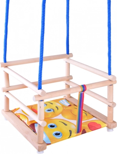 See värviline puidust lastekiik on valmistatud kvaliteetsest pöögipuidust ja viimistletud ökoloogilise veepõhise lakiga, et tagada suurem vastupidavus ja pikk kasutusiga. Komplektis on pehme iste lisamugavuseks ning turvarihm, mis kaitseb last maha libisemise eest.