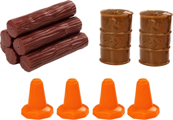 Haagise saab lihtsalt lahti ühendada, nii et lapsed võivad mängida eraldi veduki ja järelhaagisega. Komplekti kuuluvad 4 liikluskoonust, 2 tünni ja puidust palgid, mis laiendavad mänguvõimalusi ja toetavad kujutlusvõimet ning peenmotoorikat.