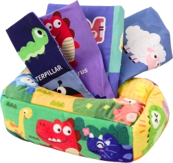 See pehme sensoorne karbike sobib suurepäraselt esimesteks avastusteks. Lapsed saavad välja tõmmata ja tagasi panna 3 krabisevat taskurätikut ja 6 värvilist kangast erinevate tekstuuridega, mis motiveerib aktiivsele mängule ja haaramise harjutamisele. Lõbusad motiivid ja erksad värvid köidavad tähelepanu ja toetavad nägemistaju.