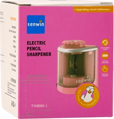Kompaktne ja stiilne roosa TENWIN teritaja pliiatsitele ja värvipliiatsitele 6–8 mm tagab kiire ja täpse terituse kodus, koolis ja kontoris. Tänu elektrilisele ja manuaalsele režiimile, vahetatavale terale (varutera on komplektis), läbipaistvale purgile laastude kogumiseks ning kaanekindlustusele on kasutamine maksimaalselt mugav. Toiteks on vajalikud 2× AA patareid (ei kuulu komplekti).