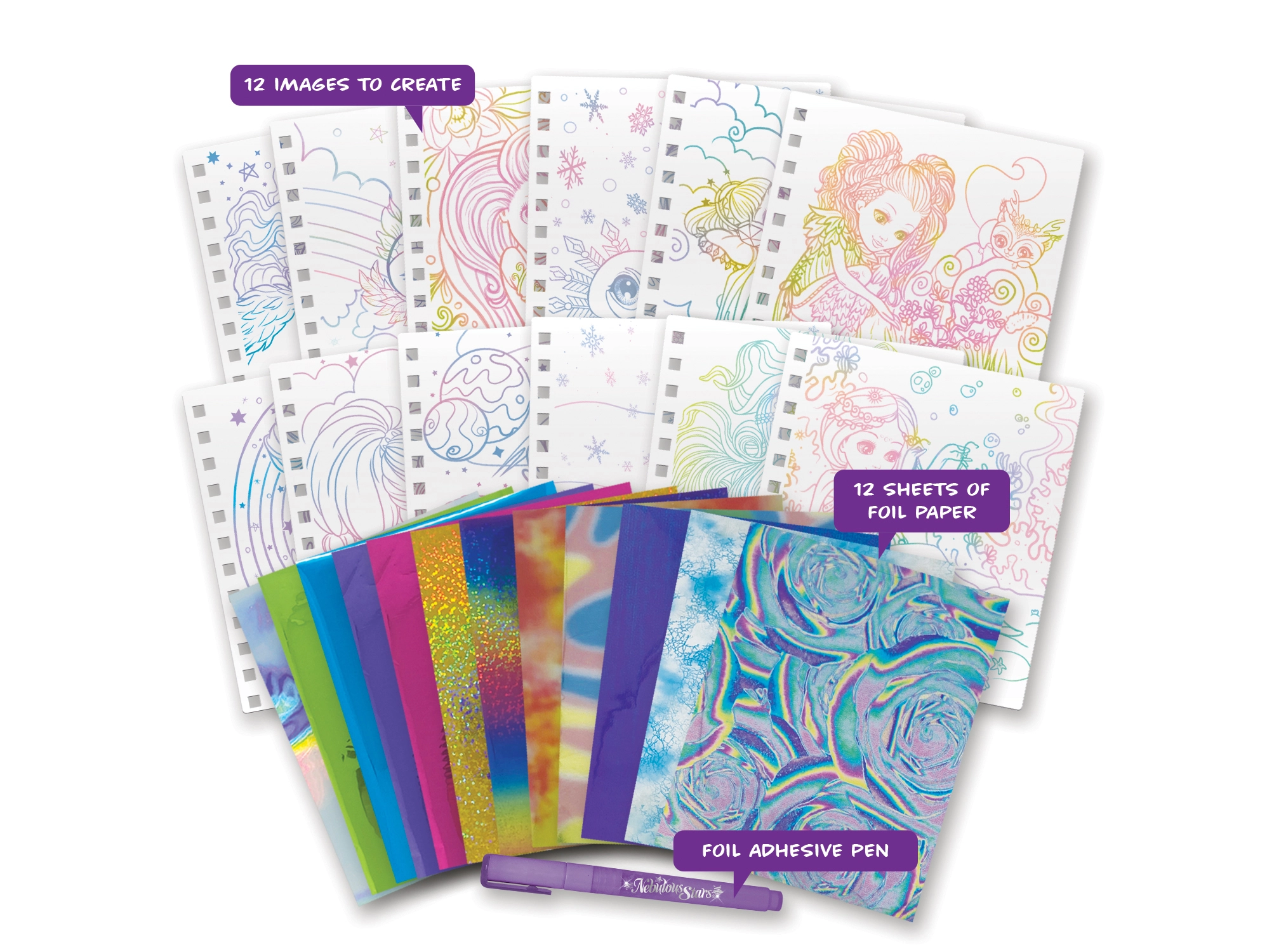 Sisaldab 12 pilti, 12 fooliumlehte, fooliumiliimi pliiatsit ja ülevaatlikke juhiseid. Ideaalne iseseisvaks loomiseks lastele alates 7. eluaastast.