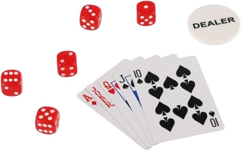 Komplekt sisaldab 300 žetooni viies erinevas värvitoonis, kahte pakki mängukaarte ja viit täringut, mis võimaldab mängida erinevaid kaardi- ja täringumänge.