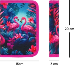 Ranitsat täiendavad ühekorruseline pinal ilma sisuta ja vastupidav kott karabiiniga ranitsa külge kinnitamiseks. Kõik mängulises troopilises flamingomustris.