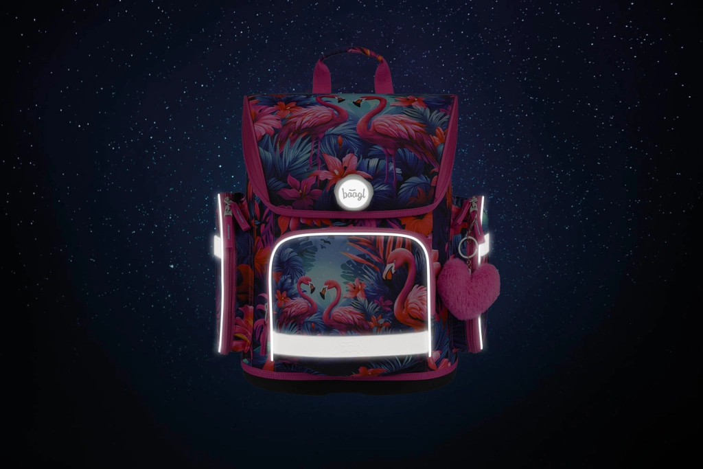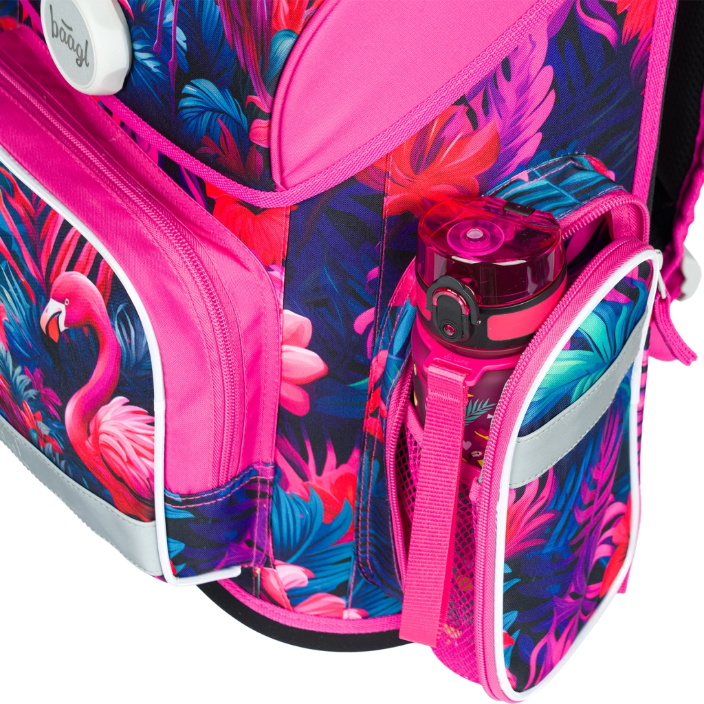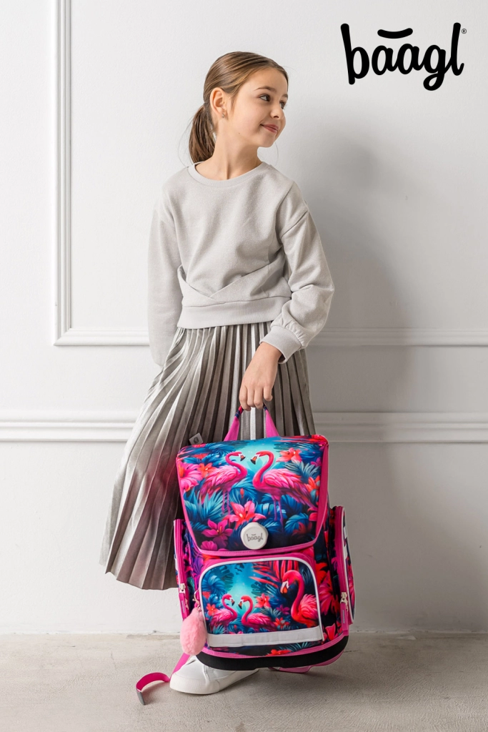 Stiilne BAAGL Ergo Flamingod koolikomplekt 1. kooliastmele sisaldab ergonoomilist ranitsat, ühekorruselist pinalit ja sussikotti. Ranitsel on reguleeritav seljasüsteem, Fidlocki magnetkinnitus, väike kaal ja helkurelemendid turvalisuse tagamiseks. Pinal ja kott on samas troopilises flamingote disainis.