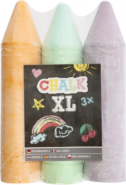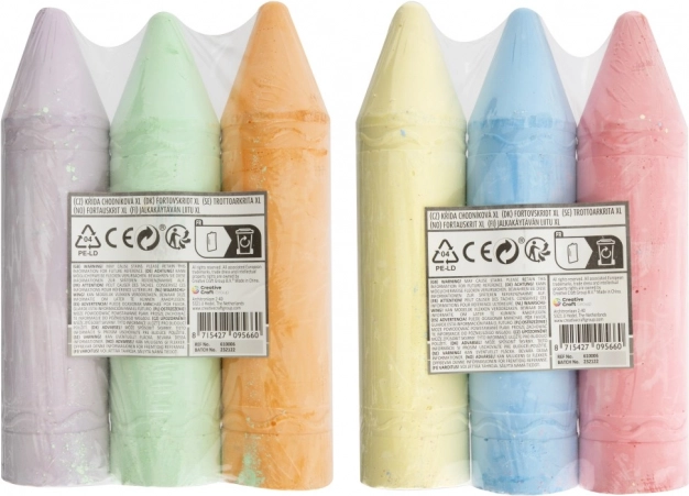 Täienda oma joonistamistegevusi nende värviliste XL-kriitidega, mis on saadaval kahes variandis – kollane, sinine ja roosa või oranž, roheline ja lilla. Iga komplekt sisaldab kolme kriiti, mille optimaalne pikkus 19 cm muudab hoidmise joonistamisel mugavaks.