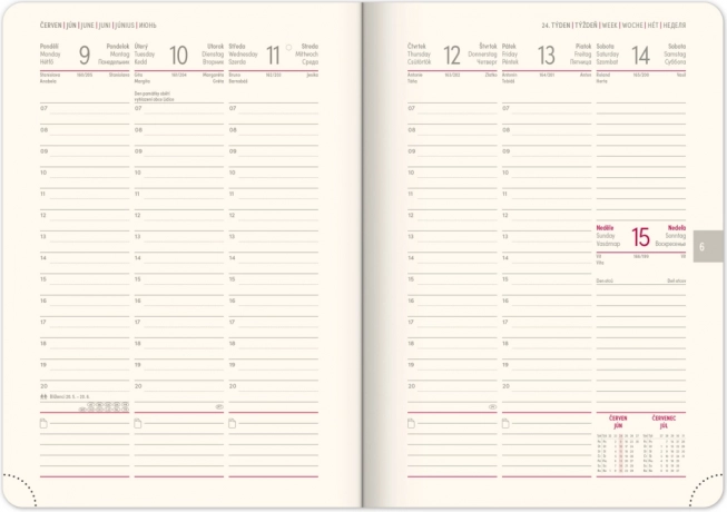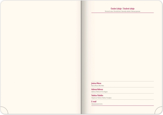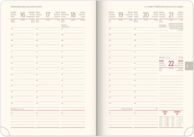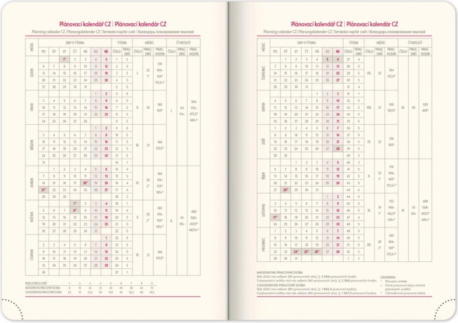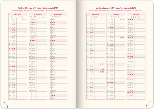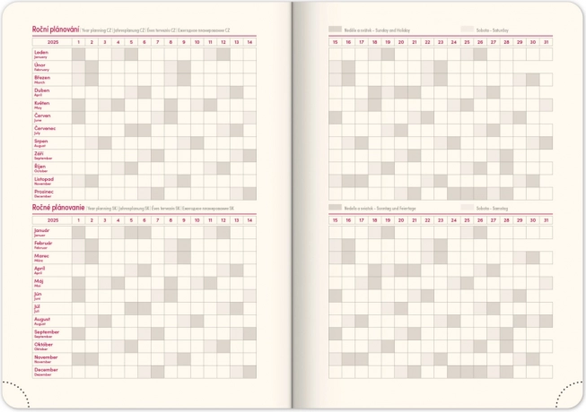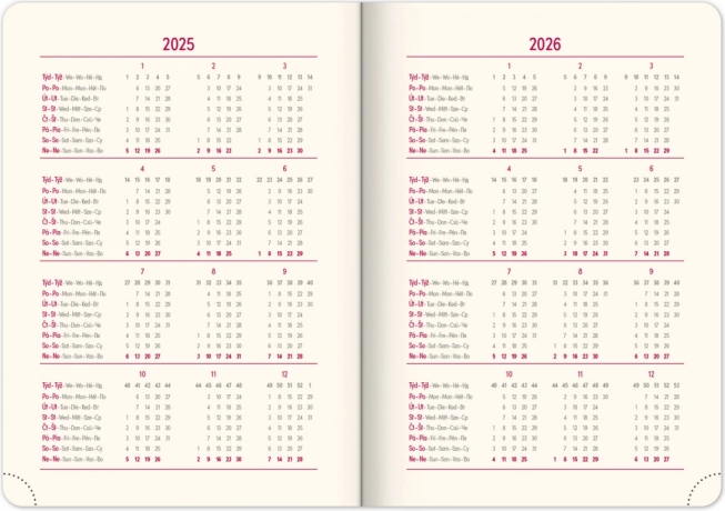 Nädalane märkmik Notique Twill 2025 elegantses sinihõbedases toonis on ideaalne abiline päevade korraldamiseks. See pakub selget nädalavaadet Tšehhi–Slovaki kalendriga ja mitmekeelsete märgenditega.