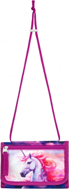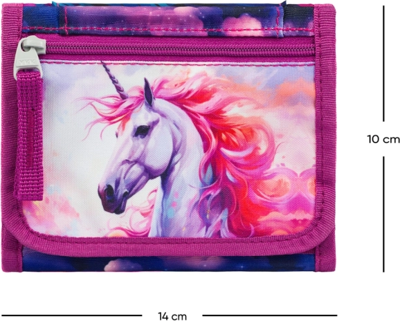 See kerge rahakott võluva ükssarvikumustriga rõõmustab iga last. Kaelapaelaga on seda mugav kanda, nii on see alati käepärast ja samal ajal turvaline. Vastupidav tekstiilmaterjal sobib igapäevaseks kasutamiseks koolis, trennides ja väljasõitudel.