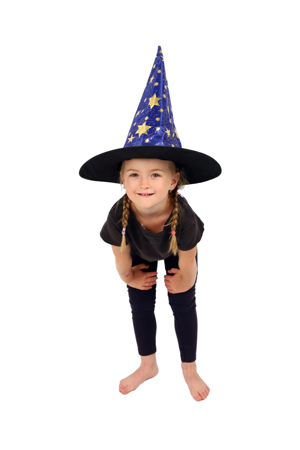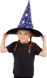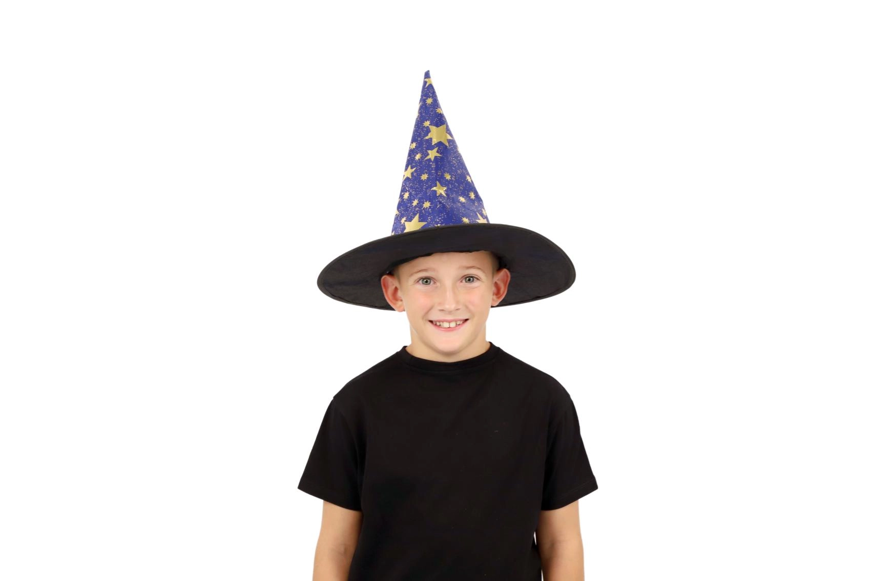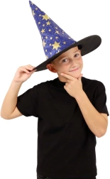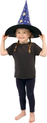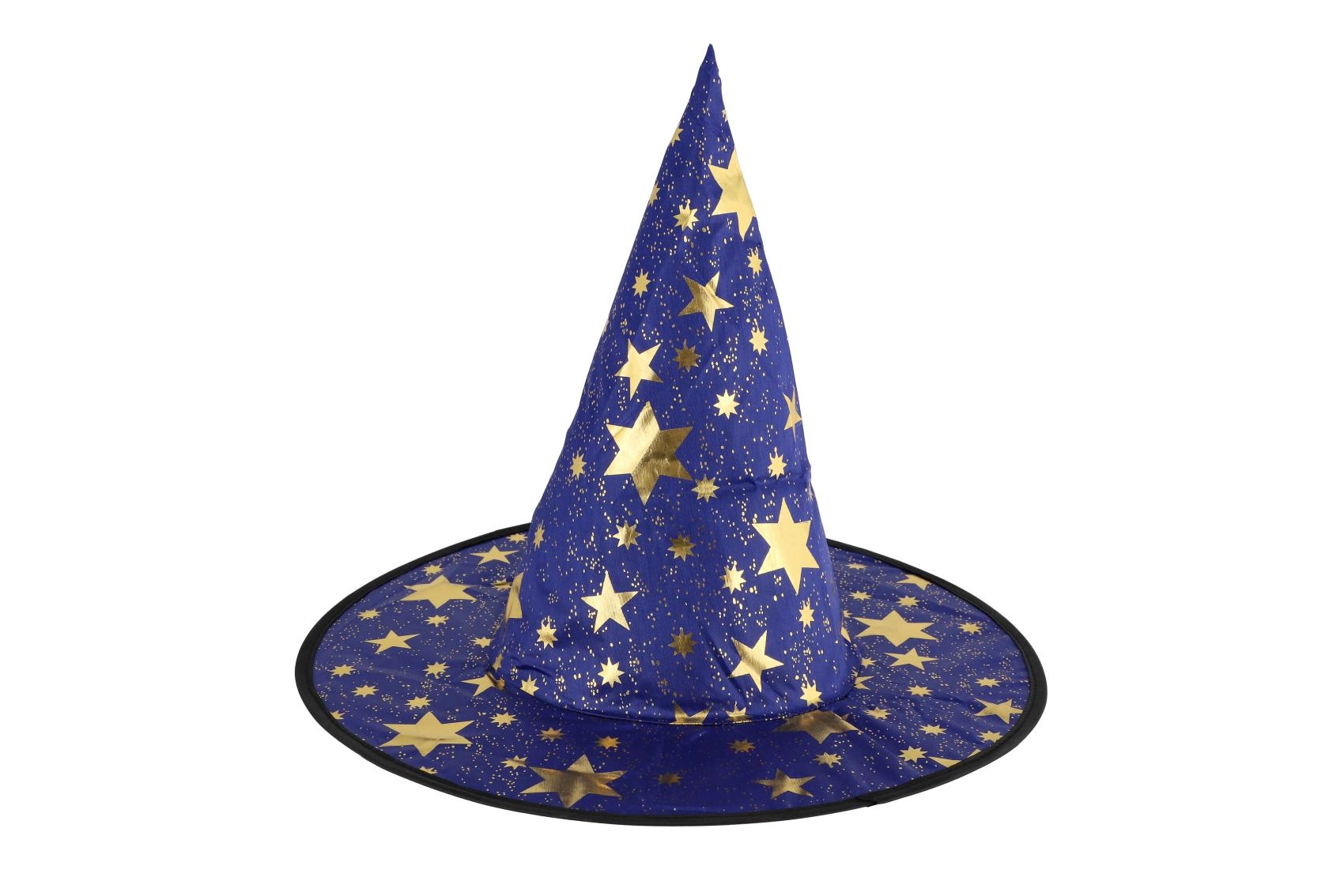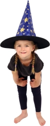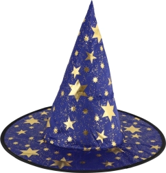 See sinikuldne nõiakaabu tähemustriga muudab iga lapse väikseks maagiks. Tänu kergelt tekstiilile on seda meeldiv kanda, see hoiab kuju ja täiendab suurepäraselt kostüümi karnevalil, maskiballil või teatrilaval.