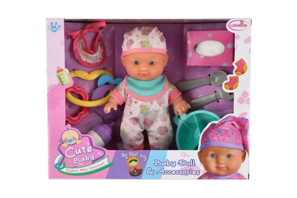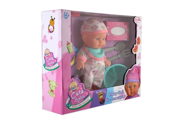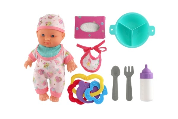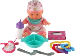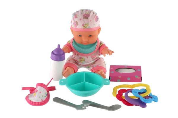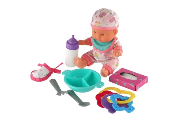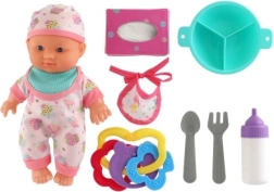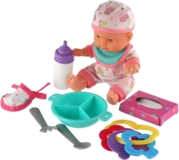 Komplektis on pudel, kõristi, niisked salvrätid ja väikelapse söögikomplekt, mis toetavad realistlikku rollimängu ning arendavad motoorseid oskusi ja sotsiaalseid rolle.