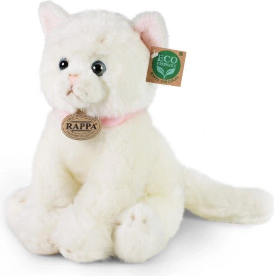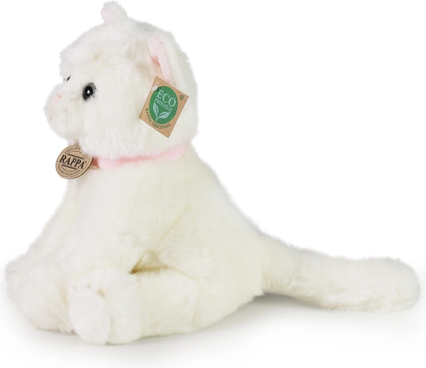 Tutvustame RAPPA kaunist plüüsikassi, mis on loodud tähelepanu detailidele ja keskkonnasäästlikkusele. See valge kass on varustatud roosa kaelarihmaga, mis rõhutab tema loomulikkust ja mängulisust.