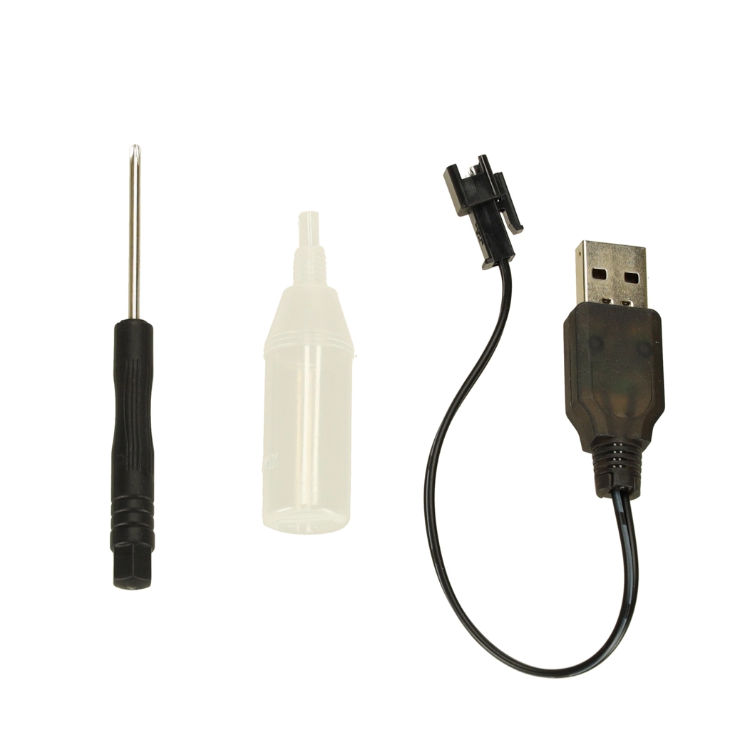 Komplektis on USB-laadimiskaabel aku mugavaks laadimiseks, kruvikeeraja ja veeanum auruefekti jaoks. Puldi toiteks on tavalised AA/AAA patareid (ei kuulu komplekti).