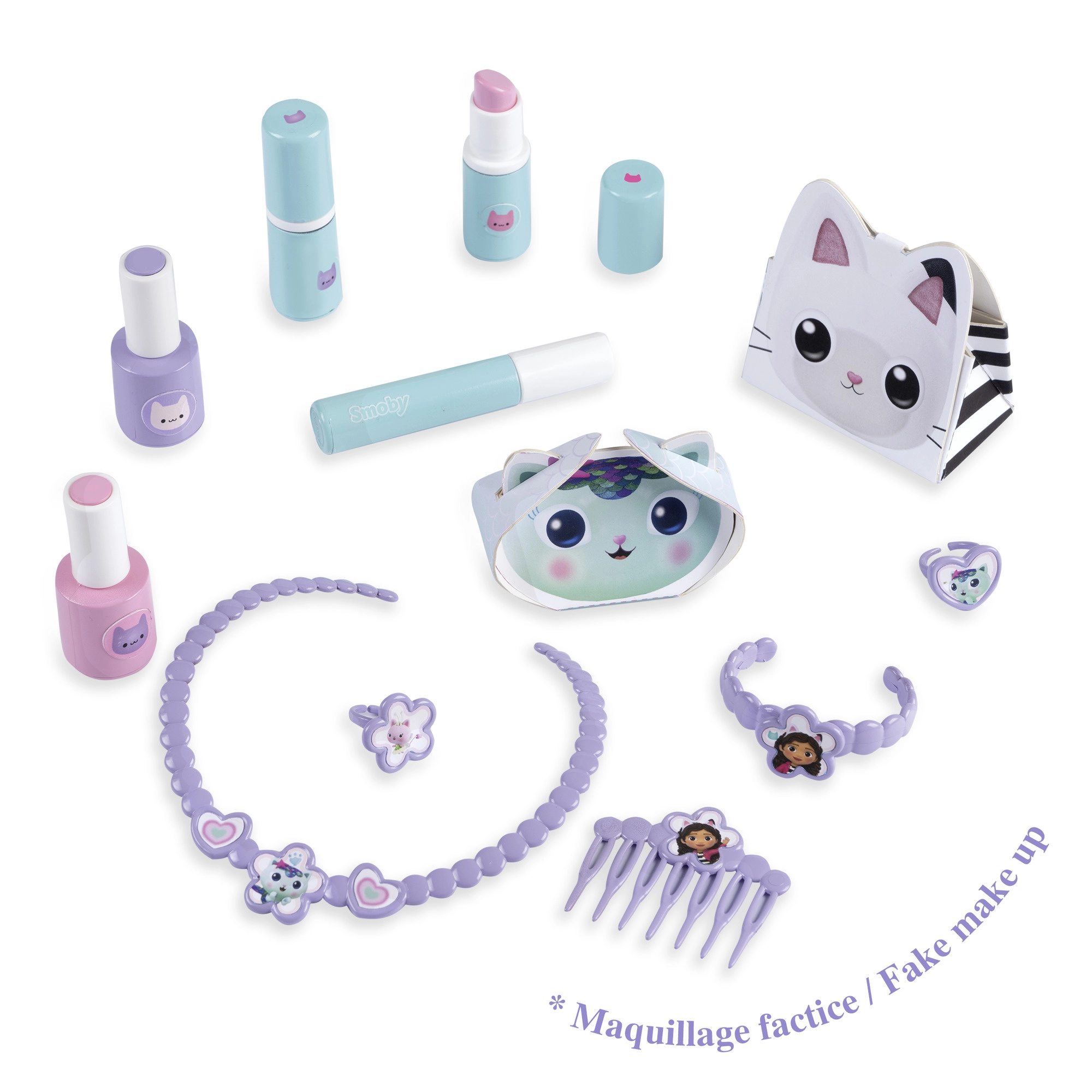 Komplekti kuuluvad „kosmeetika” pudelid, huulepulgad, ripsmetušš, kamm, kaelakee, käevõru, sõrmused ja muu realistlikuks mänguks.