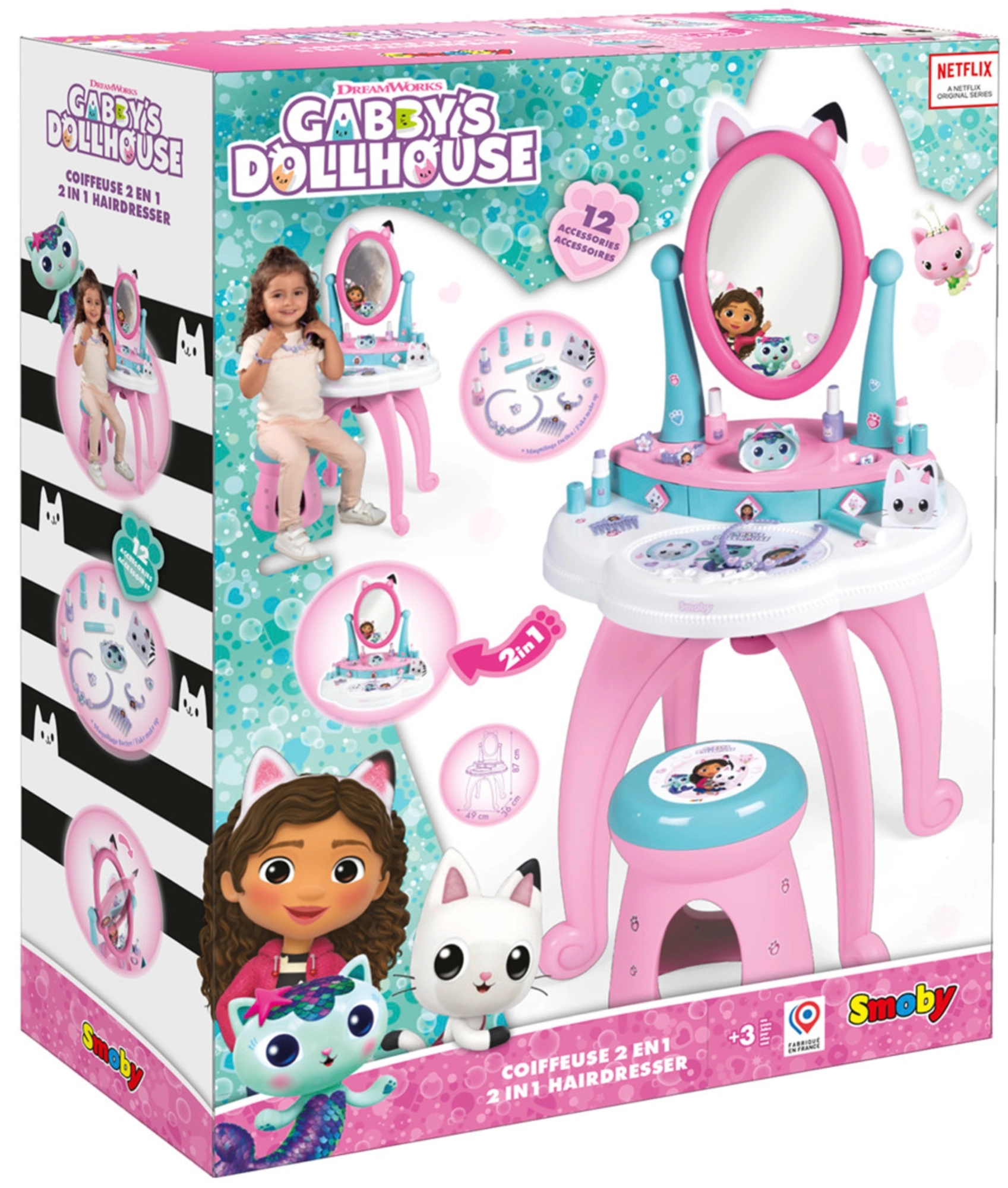 Astuge võluvasse GABBY’S DOLLHOUSE maailma Smoby 3-ühes laste tualettlauaga. See pakub föönitamist, meikimist ja küünehooldust, sellel on suur reguleeritav peegel, 3 sahtlit ja mugav taburet. Komplektis on 12 lisandit loovaks mänguks ja fantaasia arendamiseks.