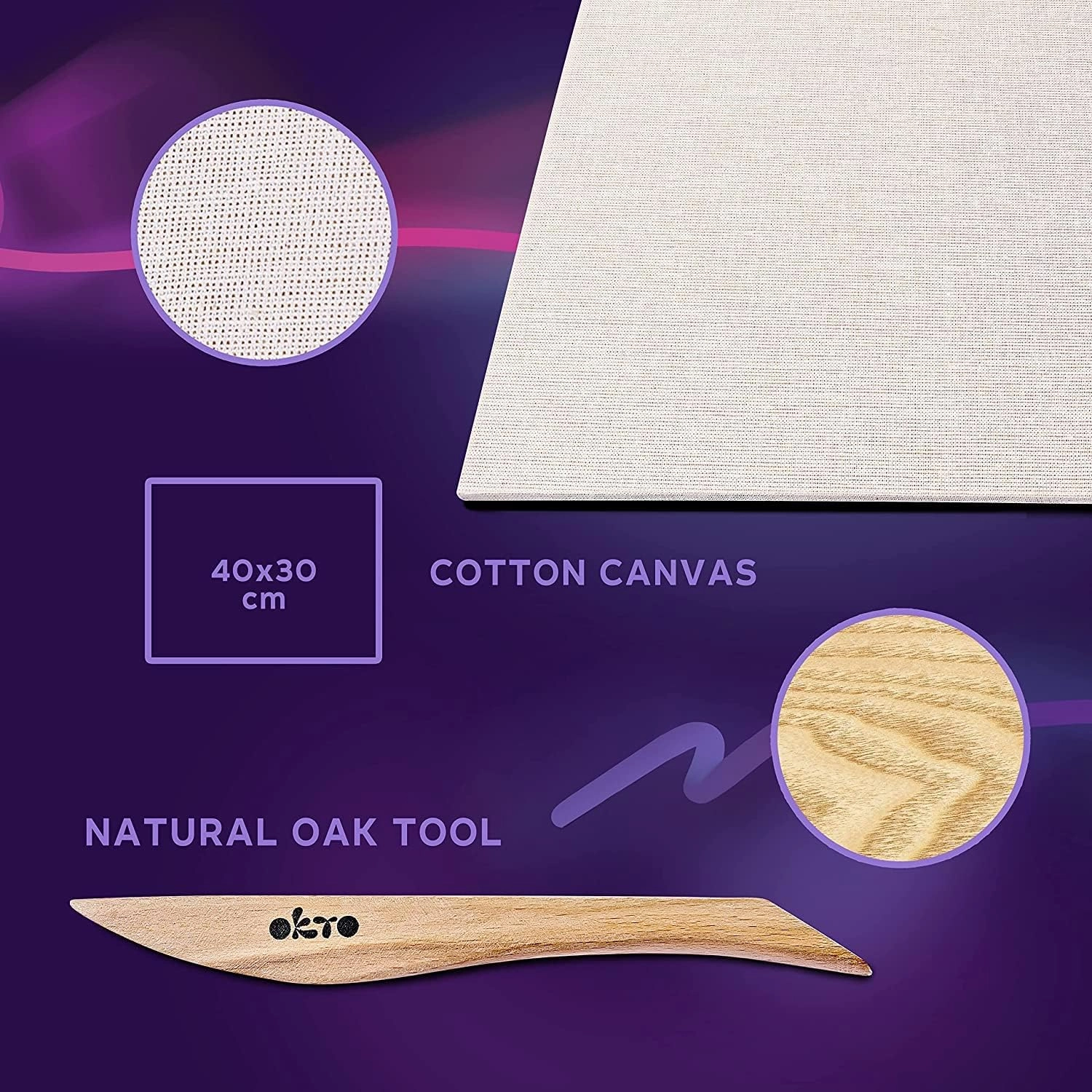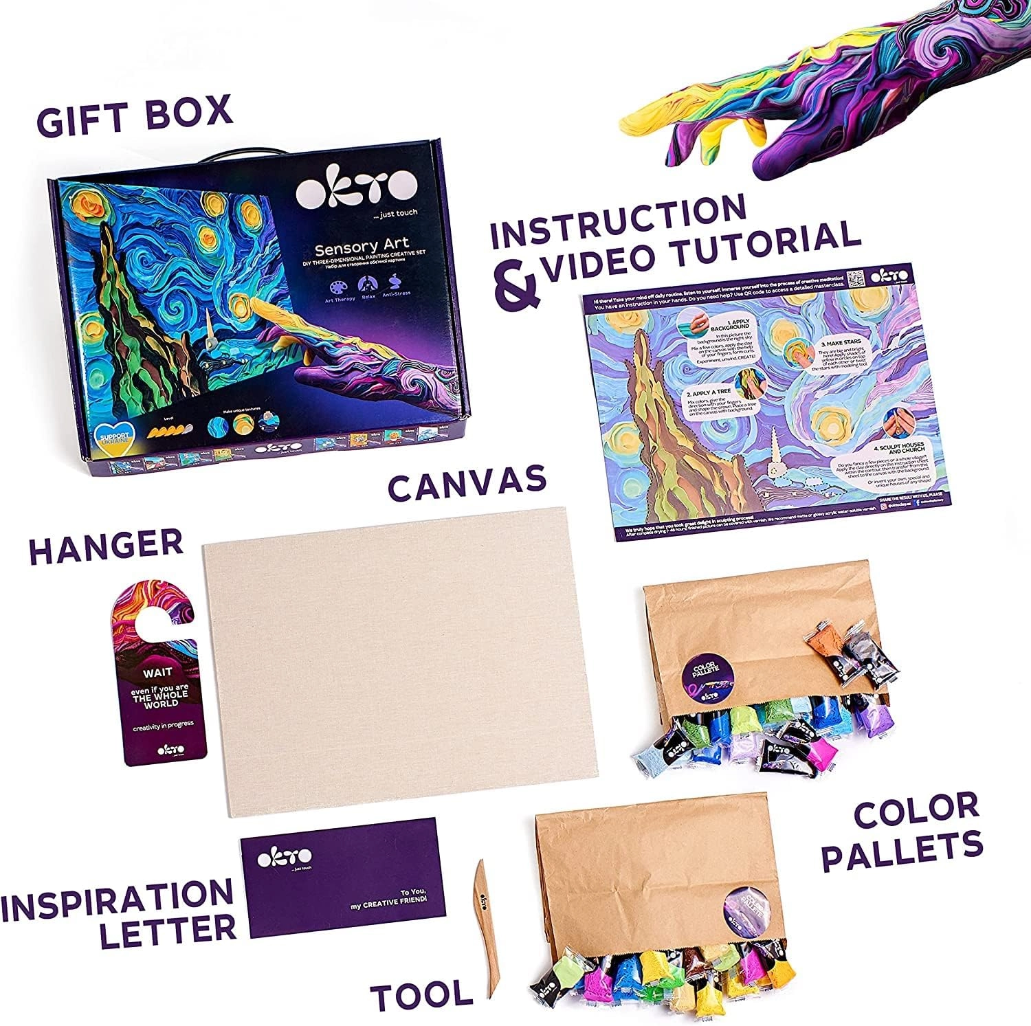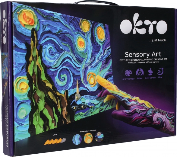 Avastage loov kogemus kunstikomplektiga Okto Sensoty Art – Tähine öö, mis on inspireeritud Vincent van Goghi meistriteosest. Isekuivava modelleerimismassi (air clay) ja sõrmedega maalimise tehnikaga loote reljeefse pildi, mille raskusaste on 4/5. Ideaalne loovuse arendamiseks ja lõõgastumiseks, lõuendiga mõõdus 30 × 40 cm ning kõik vajalik on komplektis.