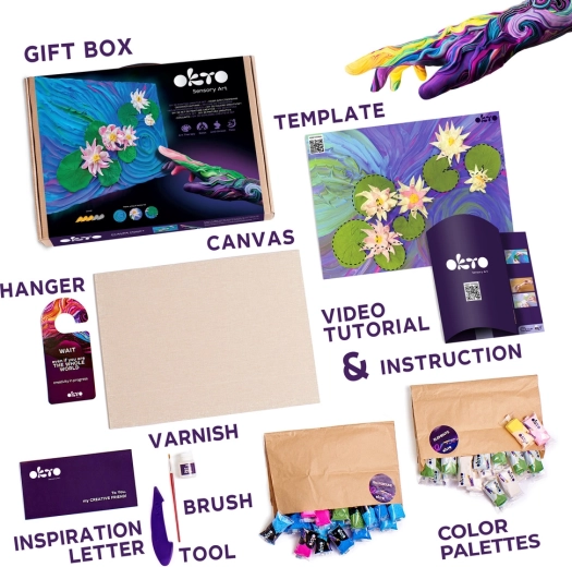 Avasta loomisrõõm Okto kunstikomplektiga „Vesiroosid” formaadis 30 × 40 cm. Pakendis on kõik vajalik oma kunstiteose jaoks: looduslik lõuend, modelleerimismassid, veega lahjendatav akrüüllakk, pintsel, puidust vormimistööriist ja arusaadav juhend.