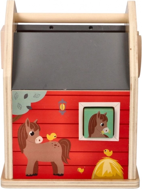 Värviline, kahepoolselt kujundatud talli meenutav majake armsate illustratsioonidega, mõeldud kaasaskantavaks mänguasjaks.