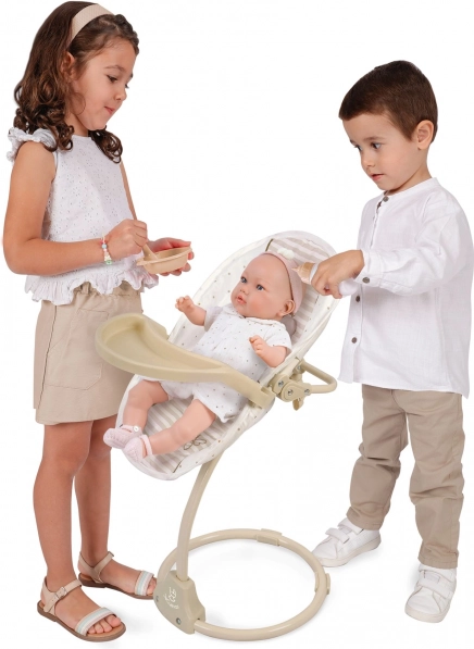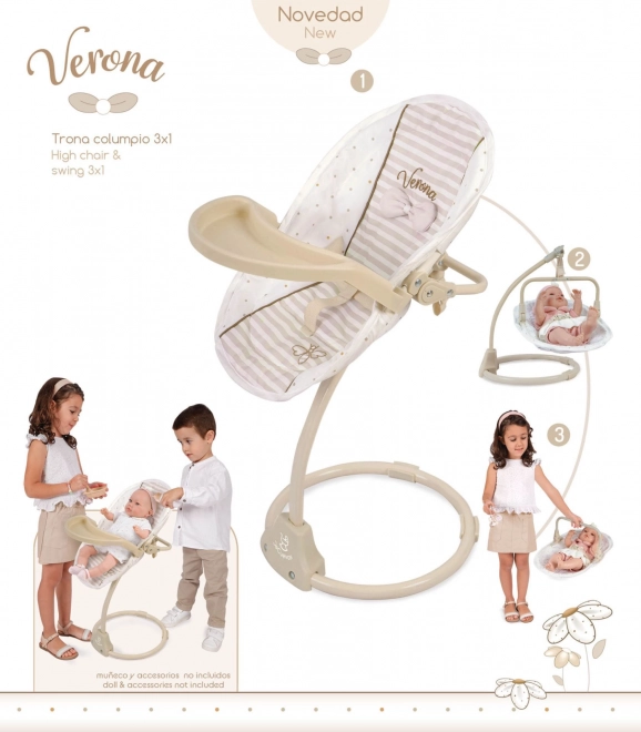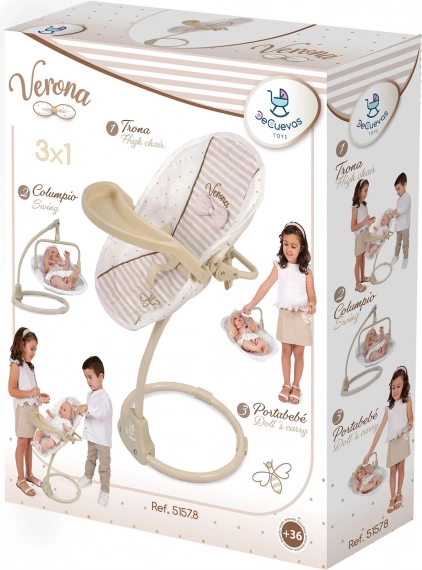 See multifunktsionaalne 3‑ühes nukkude söögitool ja kiik kollektsioonist Verona pakub lastele realistlikku mängu ja palju võimalusi oma lemmikbeebi eest hoolitsemiseks. Helebeeži ja valge kombinatsioon täppide ja triipude mustritega, mida täiendavad tagasihoidlikud kandid ja lipsukesed, loob ajatult looduslähedase ilme, mis on inspireeritud Hispaania disainist.