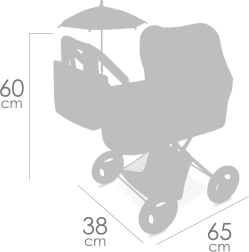 Komplekti kuuluvad praktiline päikesevari (Ø 42 cm), eemaldatav kott, korvi kate kinnitussilmustega, madrats ja alumine hoiukorv. Stabiilne metallraam, vastupidavad rattad ja kvaliteetne tekstiil tagavad mugava ja turvalise mängu.