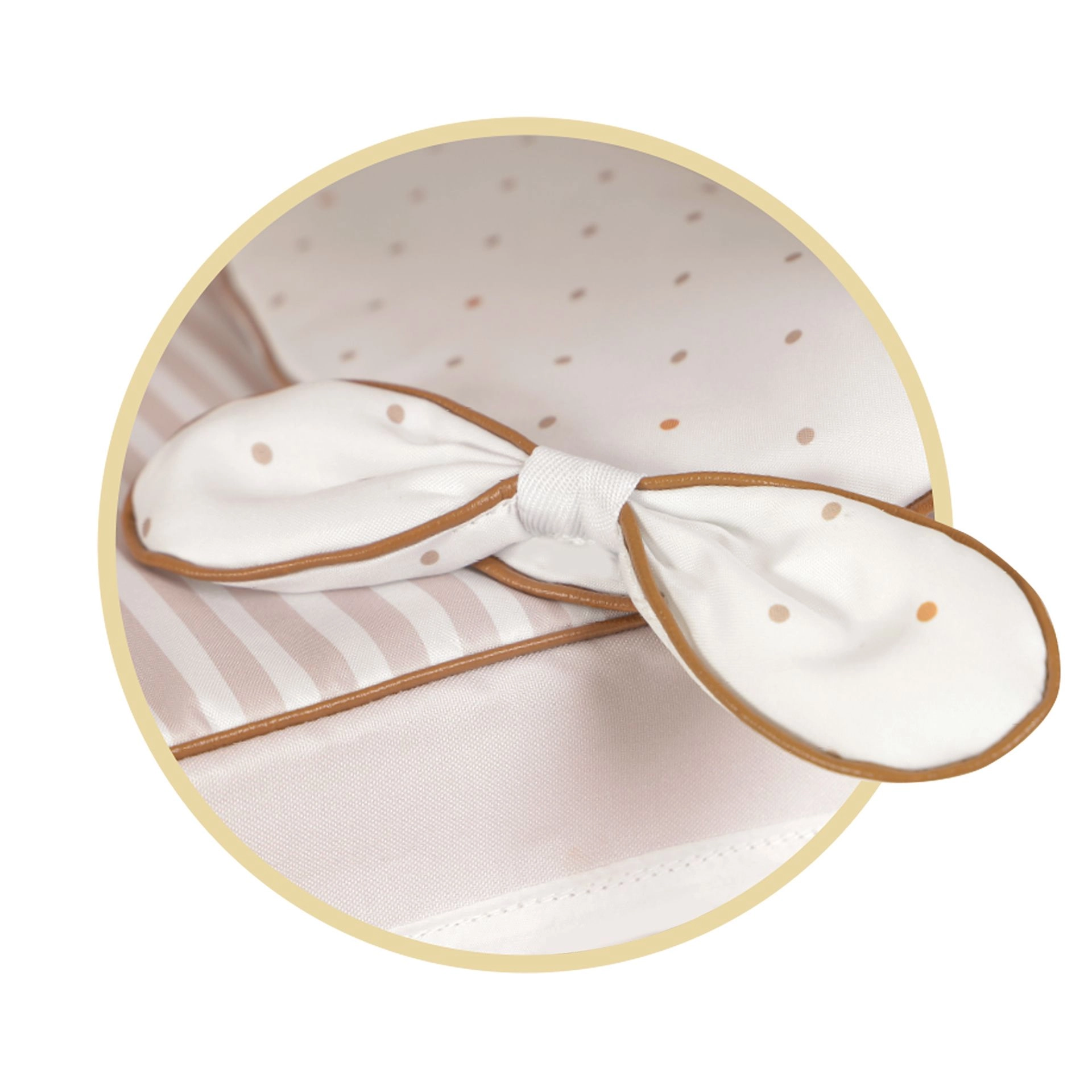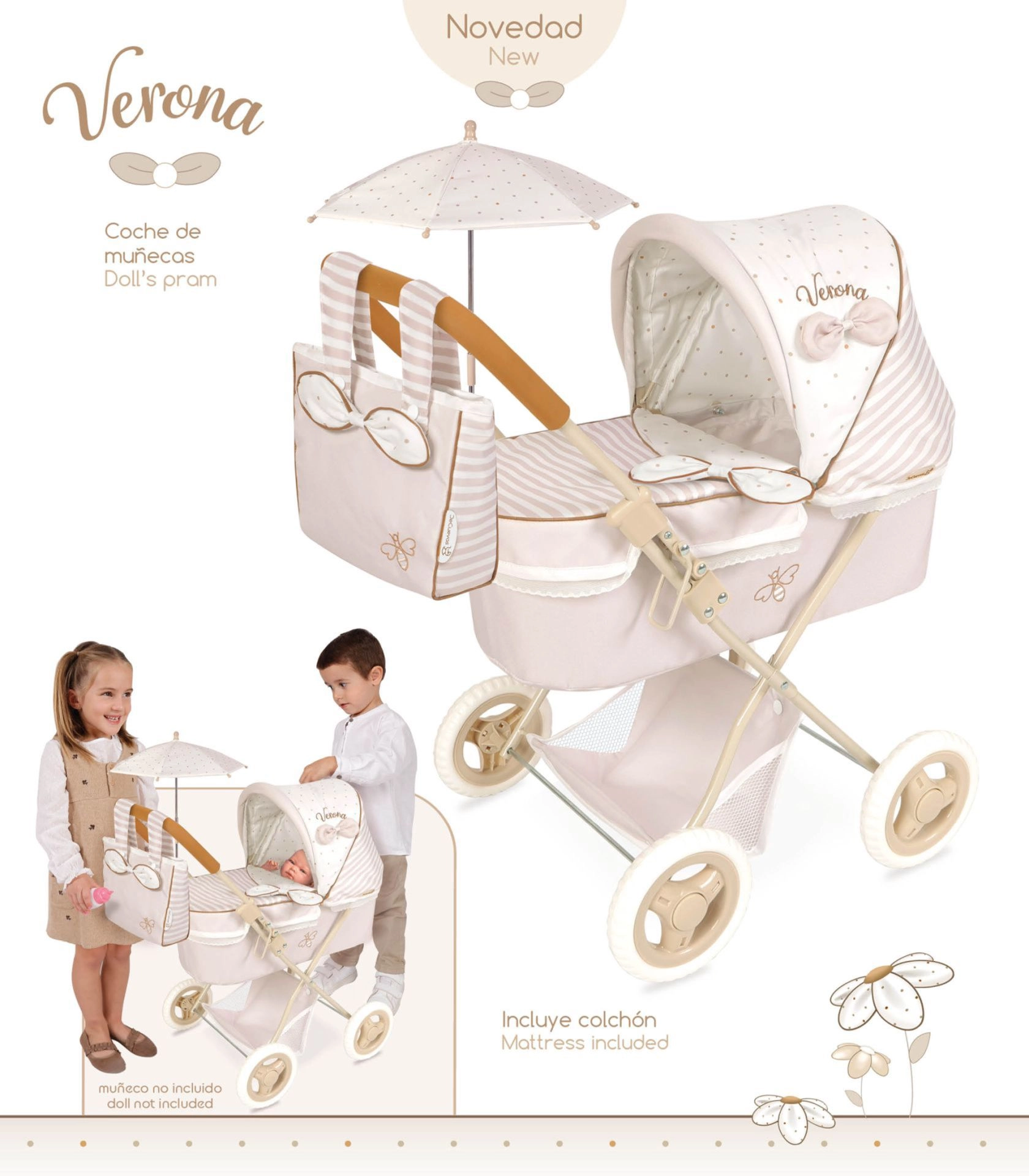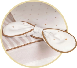 Läbimõeldud nukuvanker helebeeži ja valge kombinatsioonis, õrnade täppide ja triipudega, rõõmustab iga väikest ema. Looduslikku ilmet täiendavad armsad lipsukesed ja väikesed mesilaste tikandid. Tänu kokkupandavale konstruktsioonile on vankrit lihtne kanda ja hoiustada.