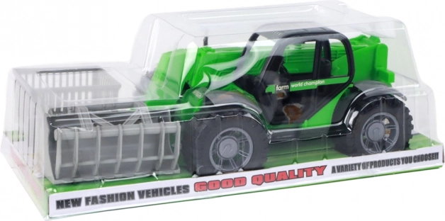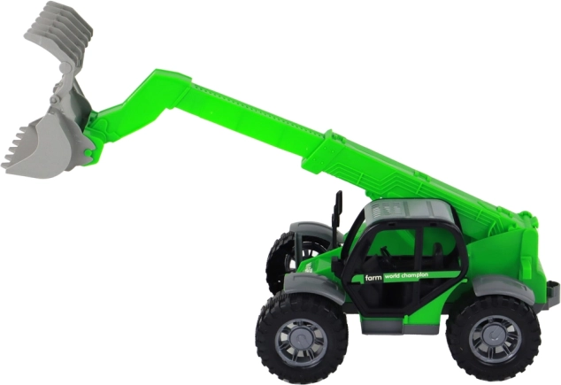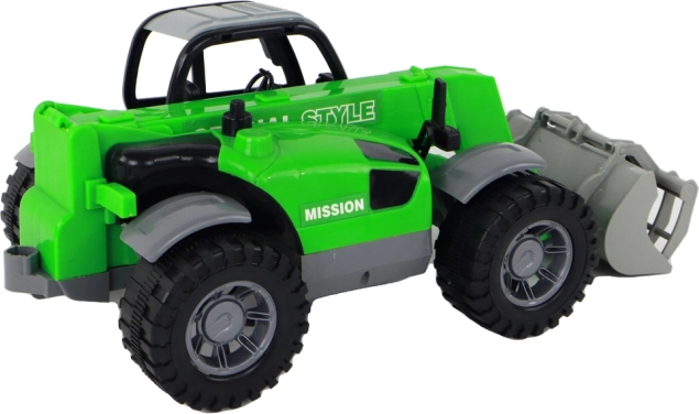 Tugev roheline laste traktor väljatõmmatava poomi ja kolme vahetatava lisaga pakub realistlikku mängu nii toas kui õues. Tänu hõõrdejõu veole, suurtele ratastele ja läbipaistvale kabiinile arendab see motoorikat ja kujutlusvõimet. Komplektis on kahvel, korbik ja puiduhaare erinevateks laadimis- ja veotöödeks.