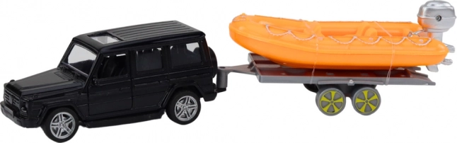 See ainulaadne komplekt ühendab maastikuauto ja paadi, mis on loodud väikestele seiklejatele, kes armastavad nii maismaa- kui mereretki. Must auto on stiilne ja varustatud veosüsteemiga, haagis aga hõlbustab paadi transporti igale vee-ekspeditsioonile!